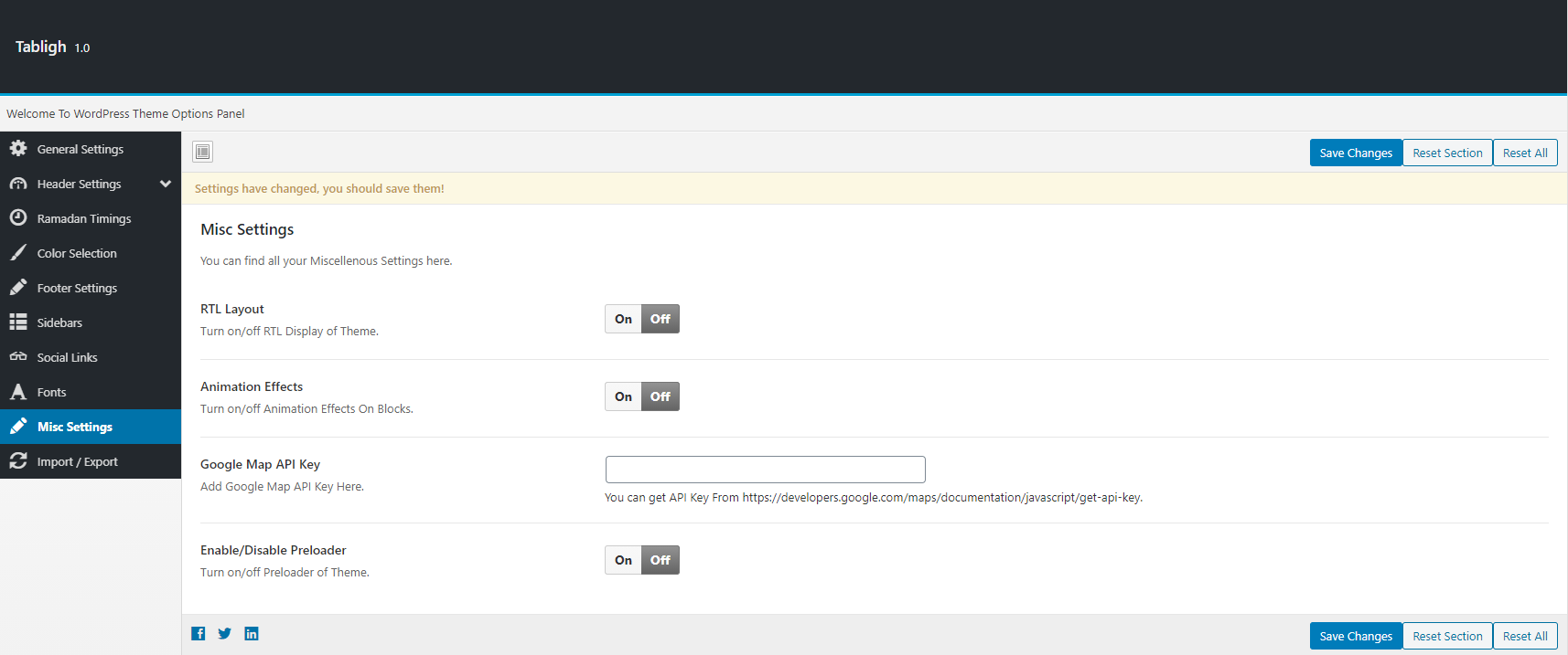 Misc options include RTL and Google Map API Key options. If maps on your site is not working, then add your own key for the site here. You can get API Key From https://developers.google.com/maps/documentation/javascript/get-api-key