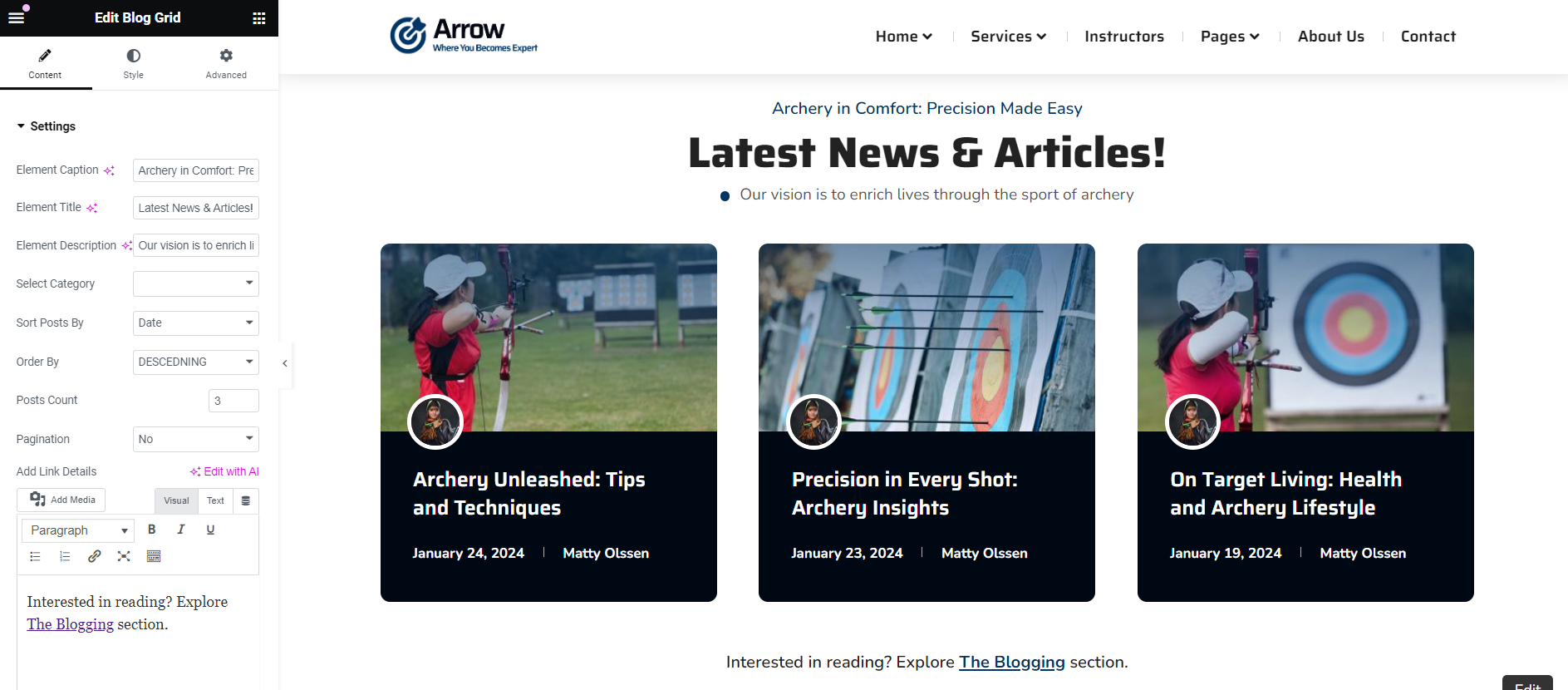 Place the elementor widget on the page and configure the settings including title, text and number of posts to display.