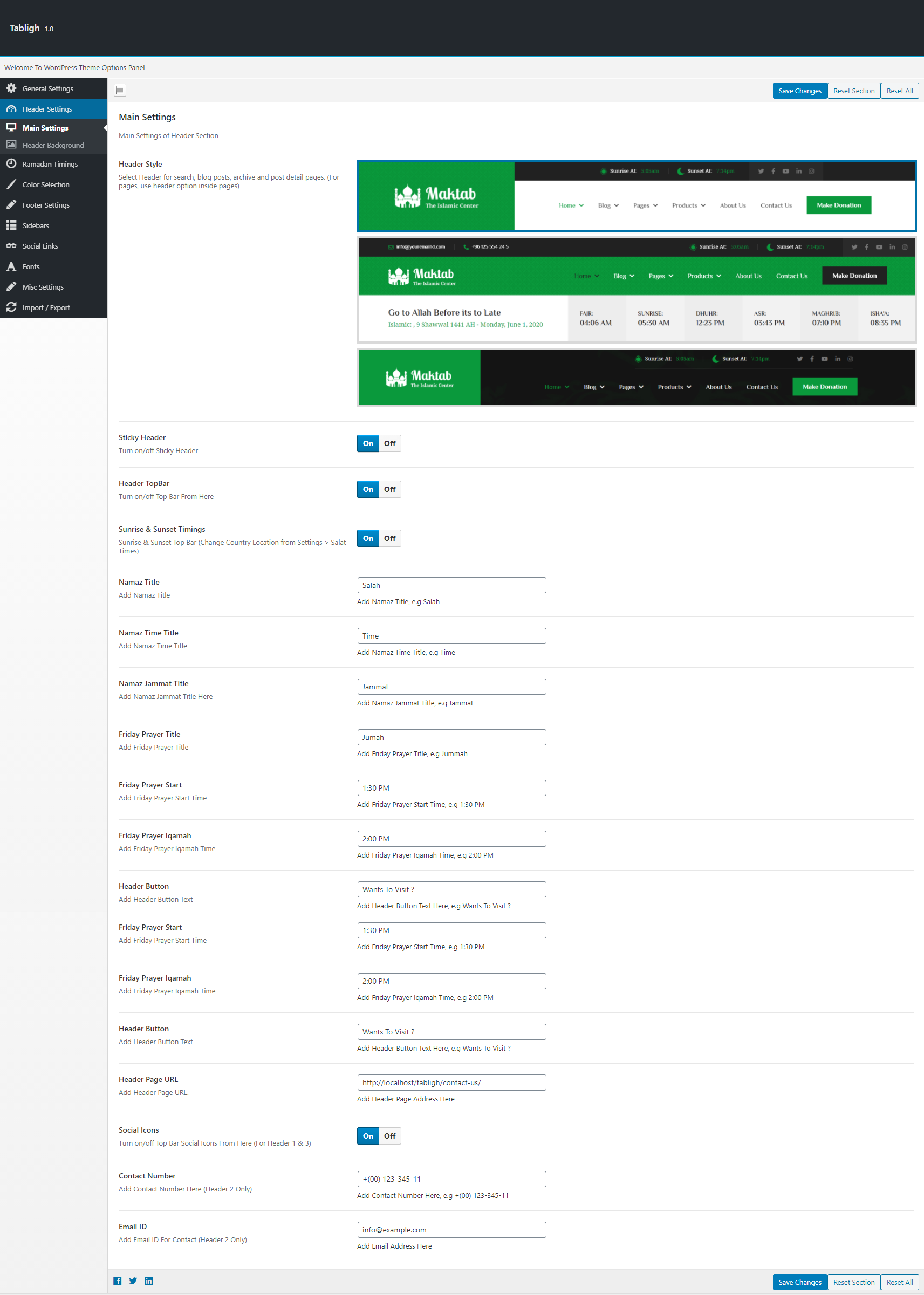 You can set your header options from here, including phone number, email address, social icons on/off. In header section you can change image for inner banner/secondary header. Enable disable breadcrumbs from this section too.